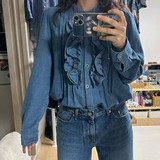 - country denim frill blouse 공지 청자켓이 잘 안 어울리는데 에옹쓰 청자켓은 잘 어울리네요! 어깨에 셔링이 잡혀 있어서 어깨선도 예뻐보이고 가...