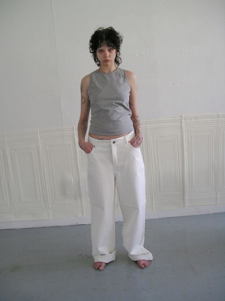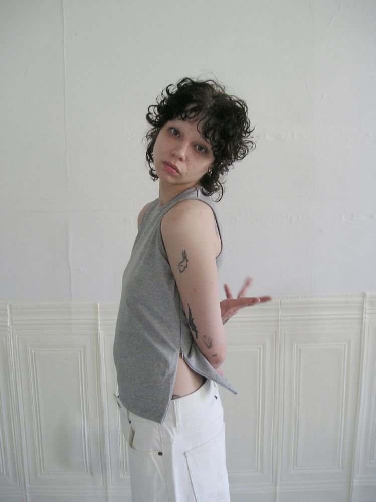 2025년 여름 베이직 아이템! 세탁기에서 막 꺼낸 듯한 거친 뉘앙스를 예상하며 뻣뻣한 코튼 나시를 준비했습니다. 이 무드를 유지하면서도 착용감을 더하기 위해 사이드 지퍼로 여닫을 수 있도록 제작했으며, 사이즈도 두가지로! 움푹 패여있는 암홀 디자인과 함께 상체 핏을 보완하여 부유방을 가려주는 아이템-prepared a stiff cotton Top, expecting a rough nuance that just came out of the washing machine. In order to maintain this mood and add to the wearability, we made it so that you can open and close it with a side zipper, and it comes in two sizes!