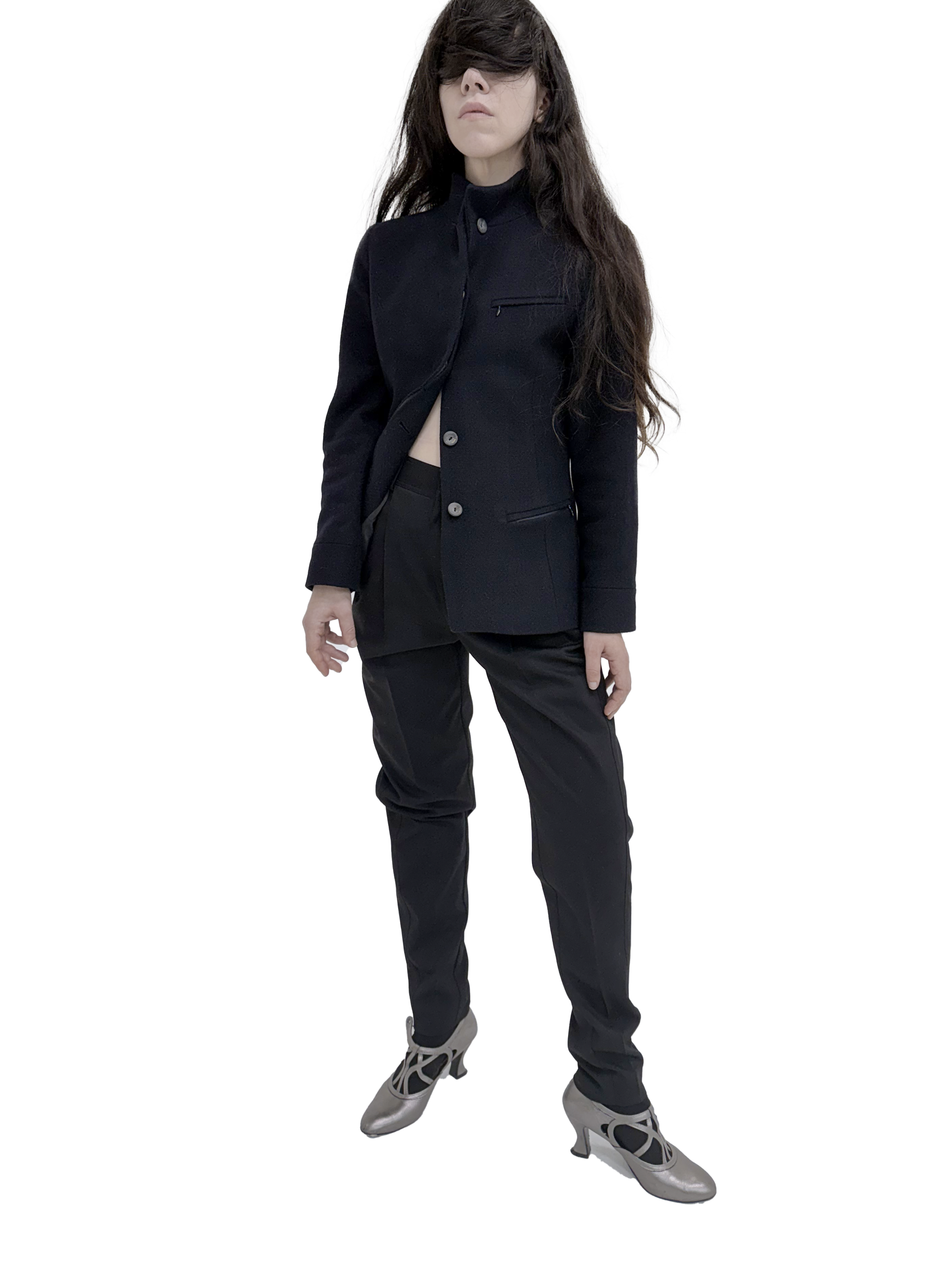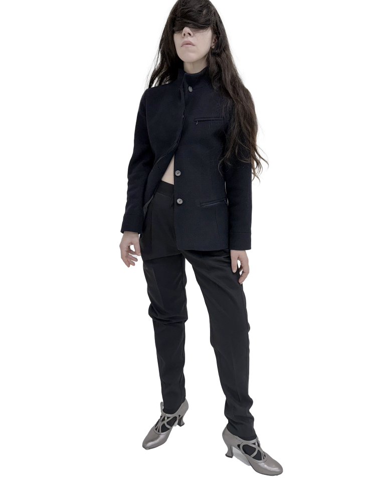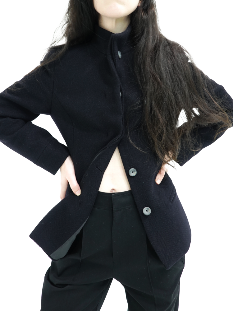 울 70% 혼용률의 코트용 원단으로 만든 이 자켓은 크지도, 작지도 않은 균형잡힌 핏으로 전반적으로 중성적인 인상을 의도했습니다. 겨울의 공기를 의식한 듯 목을 감싸는 넥카라 실루엣이 포인트. 여기에 히든 여밈이라는 개념을 살짝 비틀어 단추단이 일렁이는 착용법이 재밌어 모두 이렇게 즐기길 바라는 마음으로 버튼도 꽤 눈에 들어오는 디자인을 제작했습니다. 절제미를 담은 적당히 잡힌 허리라인으로 기본 니트나 가벼운 재킷 정도까지 레이어드가 가능해요, 와이드팬츠나 에옹쓰의 토넬 블라우스도 무난히 잘 어울리는데, 윈드브레이커로 바람결에 휘날리는 듯한 무심한 스타일링이 특히 멋스럽습니다.