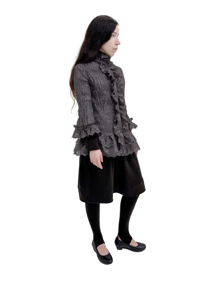 토넬 펀칭 블라우스입니다. 얇고 밀도가 높으며, 살짝 광택감이 묻어나요. 하이넥과 벨소매 실루엣, 그리고 조숙한 뉘앙스의 컬러감이 한층 '숙녀' 스러운 인상을 줍니다. 그치만 디테일은 철없음, 서로가 부딪혀 자글거리며 시끌한데 묵직한 컬러감이 고요히 덮어주는 느낌. 가시(thorn)에 el 를 붙여 '토넬'이라는 네임을 지어주었습니다. 거친 낭만, 중세적 질감!