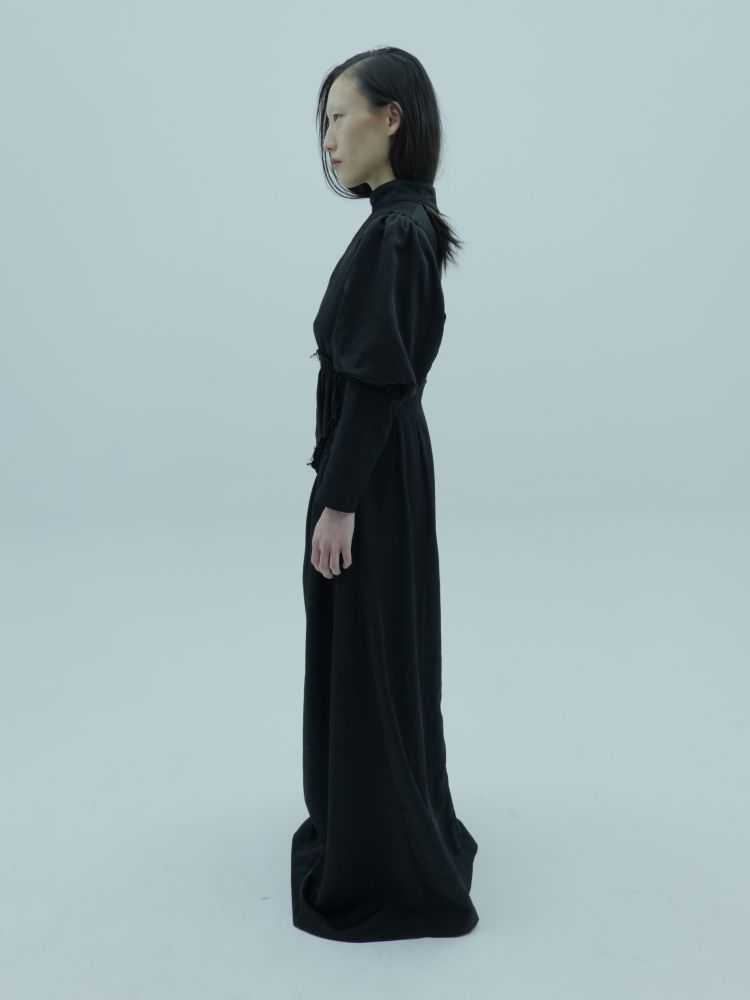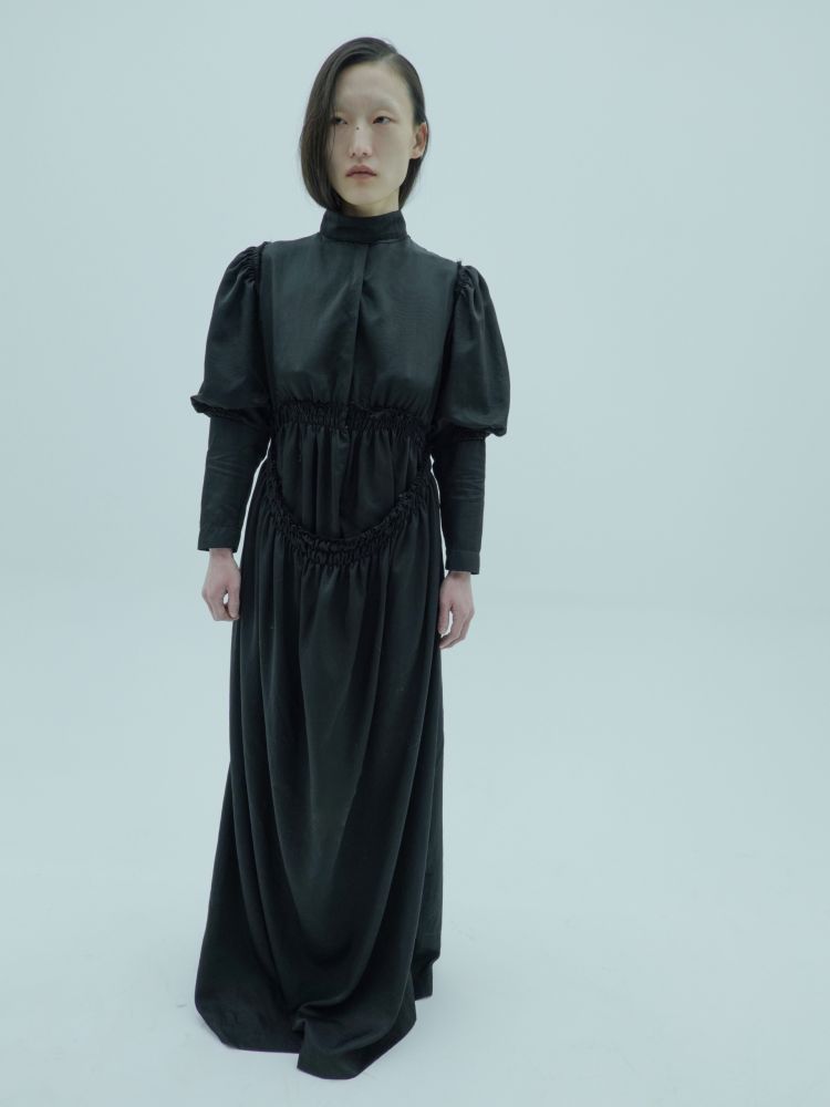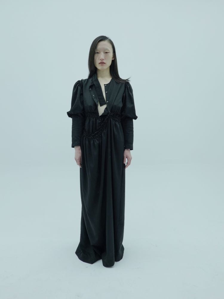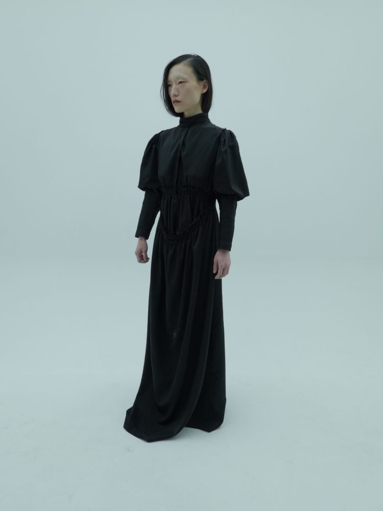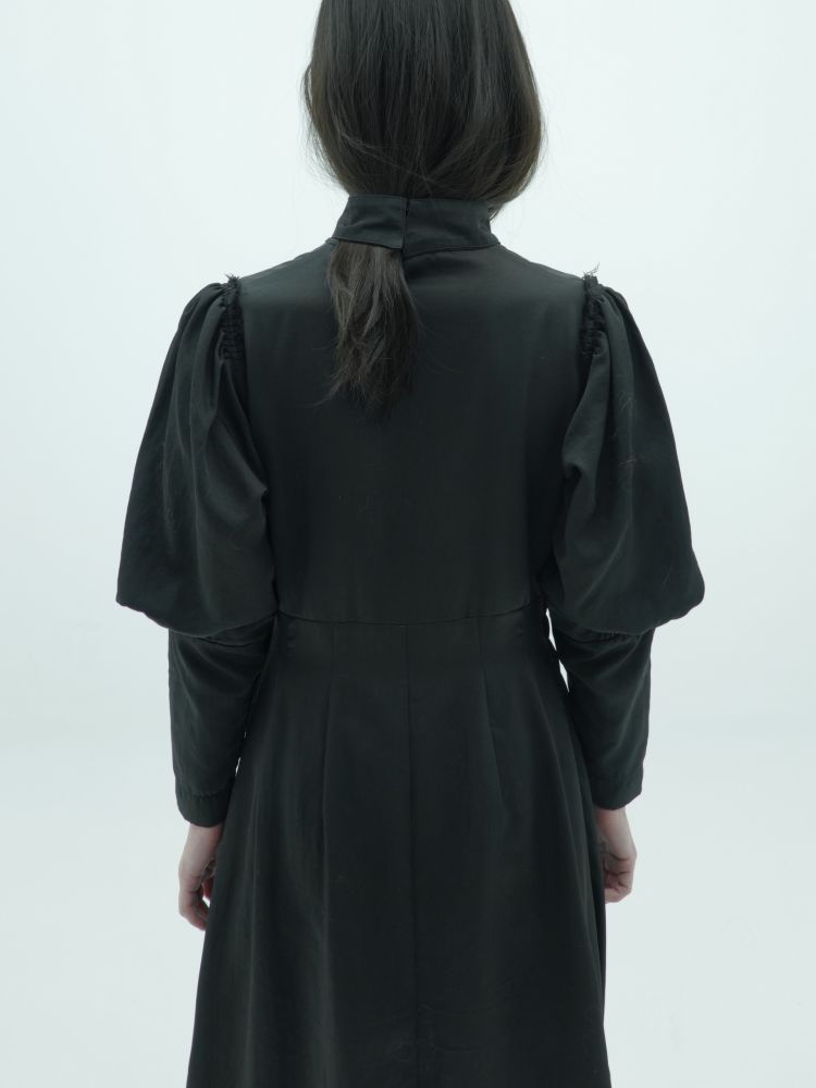 하이넥 네크라인부터 오픈 클로징까지, 전면을 스냅과 걸고리만으로 구성해 1900년대 의복에서 느껴지던 집요할 정도의 작업성을 느껴지게 합니다. 소매에는 디스트로이드 밴딩 디테일을 더해 앤틱한 결을 한층 강조했고, 반대로 몸판은 과감히 장식을 덜어내어 전체 무드가 과해지지 않도록 균형을 맞췄습니다. 하이넥을 단정히 채워 입어도 좋고, 가볍게 풀어 힘을 빼도 좋아요. 희끗 보여지는 스냅에 뭔가 기분이 더 좋거든요. 안쪽에 티셔츠를 레이어드하면 괜시리 모던해지는 느낌이 들기도 합니다. 이 드레스에서 에옹쓰가 드러내고자 했던것, 포털사이트에 '에옹쓰'를 검색했을 때 뜨는 그 내용, '모던의 뒷면' 바로 그 자체의 모습을 실현한는 것!