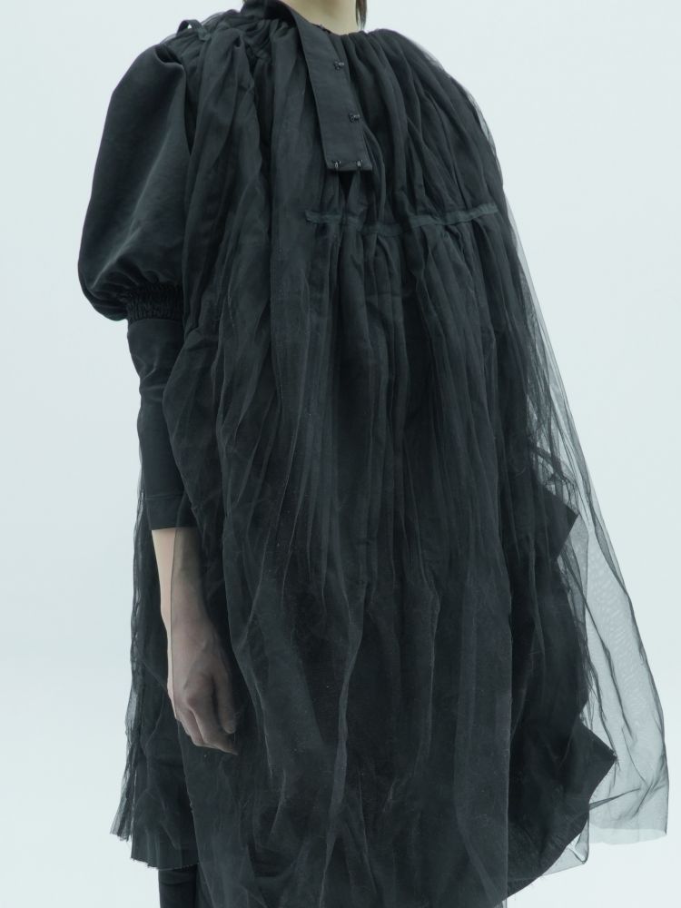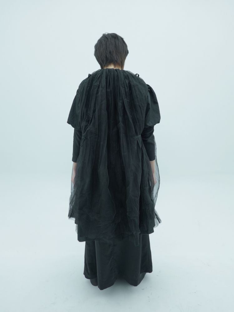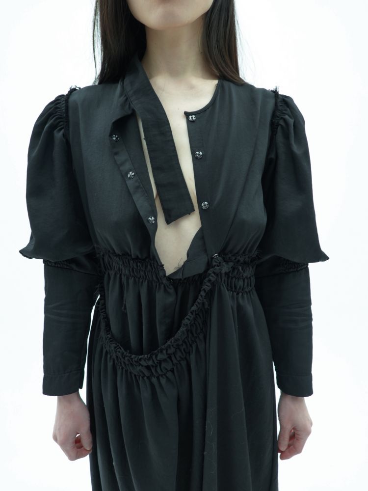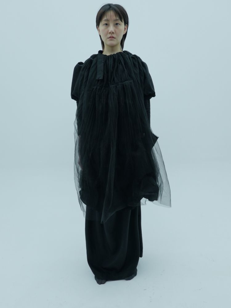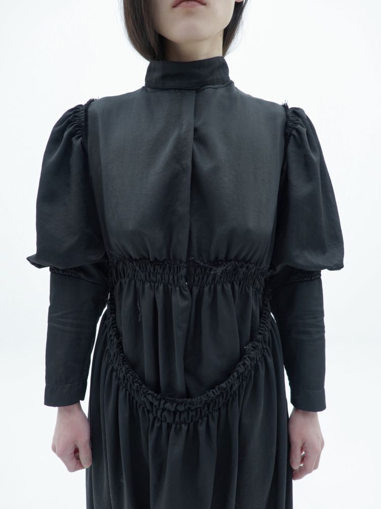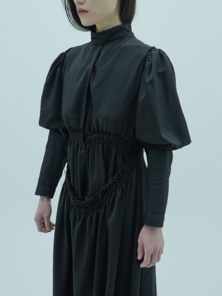 하이넥 네크라인부터 오픈 클로징까지, 전면을 스냅과 걸고리만으로 구성해 1900년대 의복에서 느껴지던 집요할 정도의 작업성을 느껴지게 합니다. 소매에는 디스트로이드 밴딩 디테일을 더해 앤틱한 결을 한층 강조했고, 반대로 몸판은 과감히 장식을 덜어내어 전체 무드가 과해지지 않도록 균형을 맞췄습니다. 하이넥을 단정히 채워 입어도 좋고, 가볍게 풀어 힘을 빼도 좋아요. 희끗 보여지는 스냅에 뭔가 기분이 더 좋거든요. 안쪽에 티셔츠를 레이어드하면 괜시리 모던해지는 느낌이 들기도 합니다. 이 드레스에서 에옹쓰가 드러내고자 했던것, 포털사이트에 '에옹쓰'를 검색했을 때 뜨는 그 내용, '모던의 뒷면' 바로 그 자체의 모습을 실현한는 것!