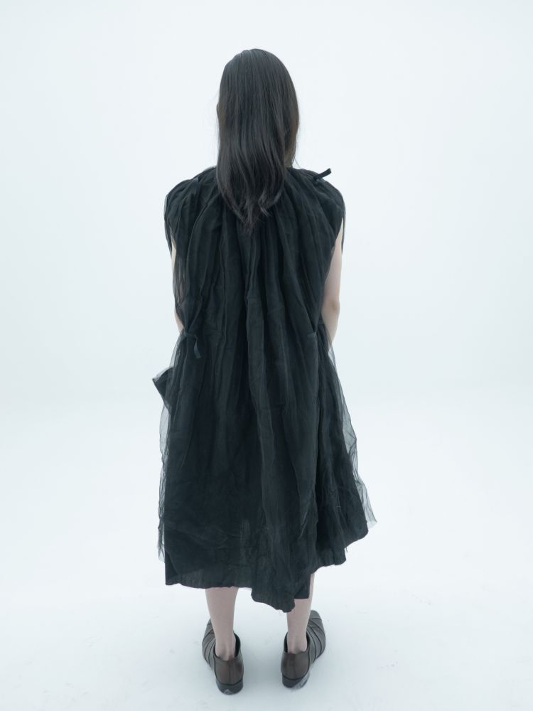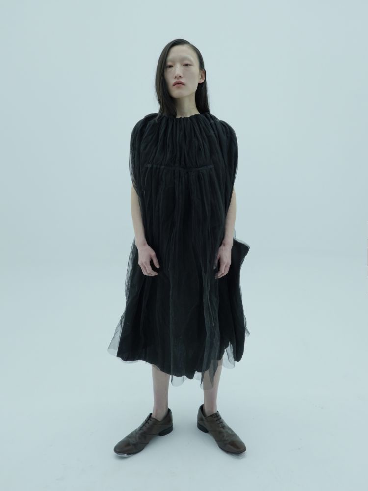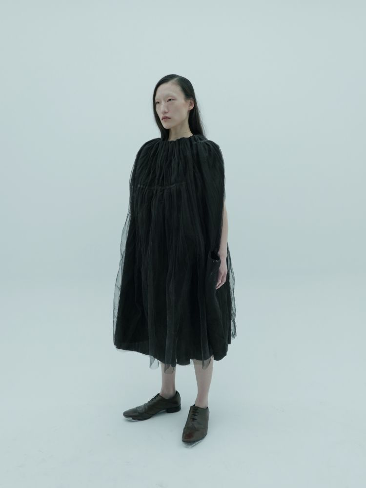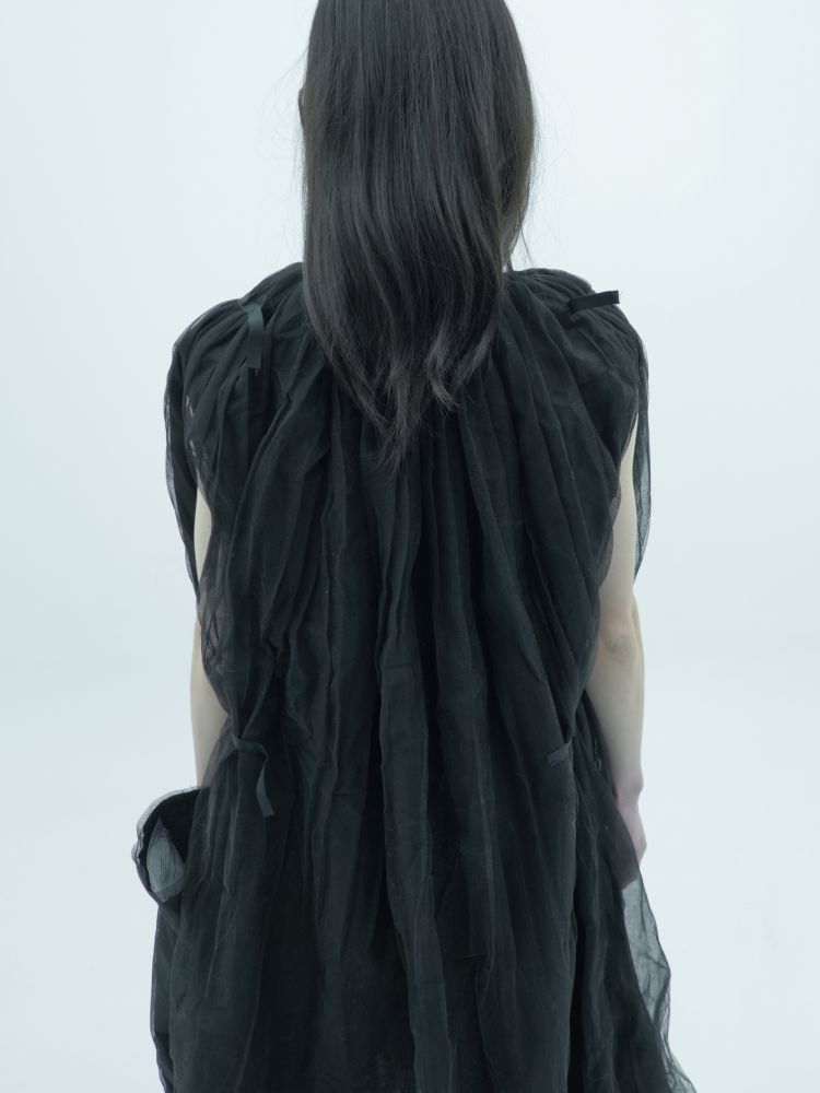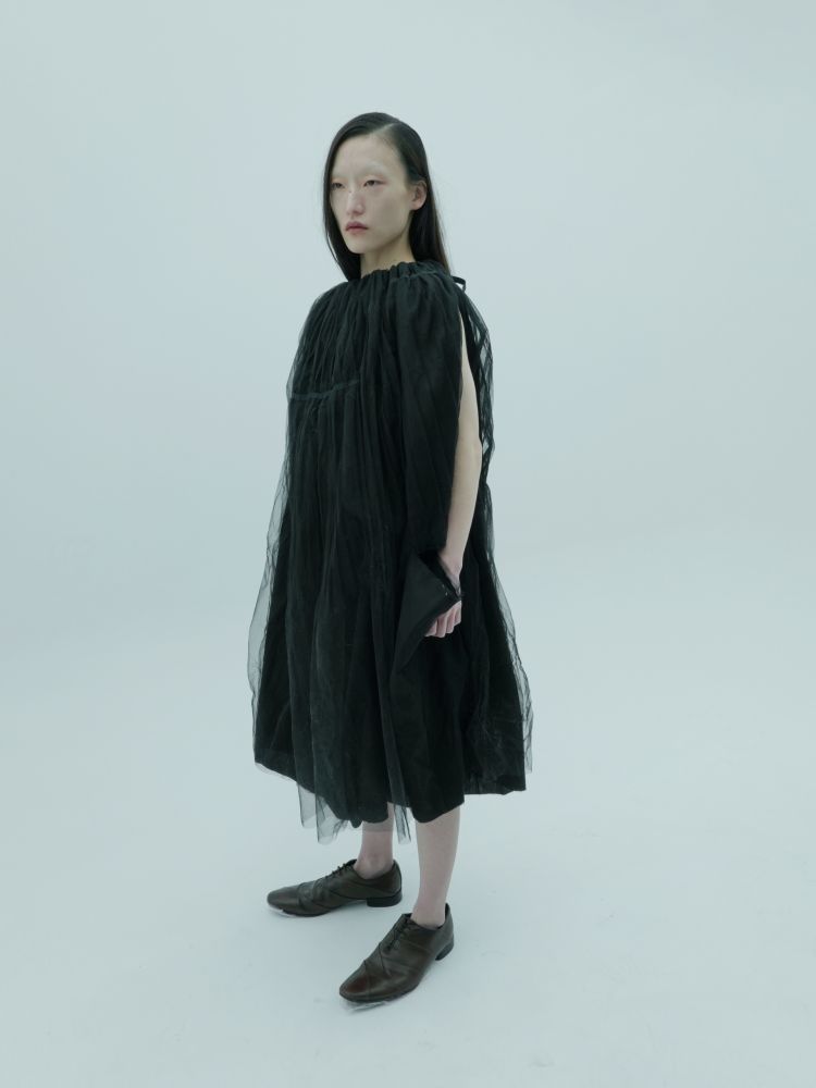 에옹쓰의 2026 샤샤 드레스. 케이프 뉘앙스로 고풍스럽게 착용되나 박다 만 듯한 테이프감, 마구 구겨져있는 주름으로 괴랄한 느낌이 더해진 샤샤 드레스 입니다. 뒷쪽에 달려있는 지퍼로 팔을 넣어 착용되며,주름작업을 거친후 손으로 하나하나 잡아내어 봉제하는 고난이도 작업으로 우글우글 우는 듯한 러프한 느낌이 더해져있습니다. 거침으나, 에옹쓰만의 고풍미. 그리고 툭튀가 더해진 샤샤드레스는 오직 블랙 한 컬러! eont's 2026 SHSAHA DRESS inspired by grandma