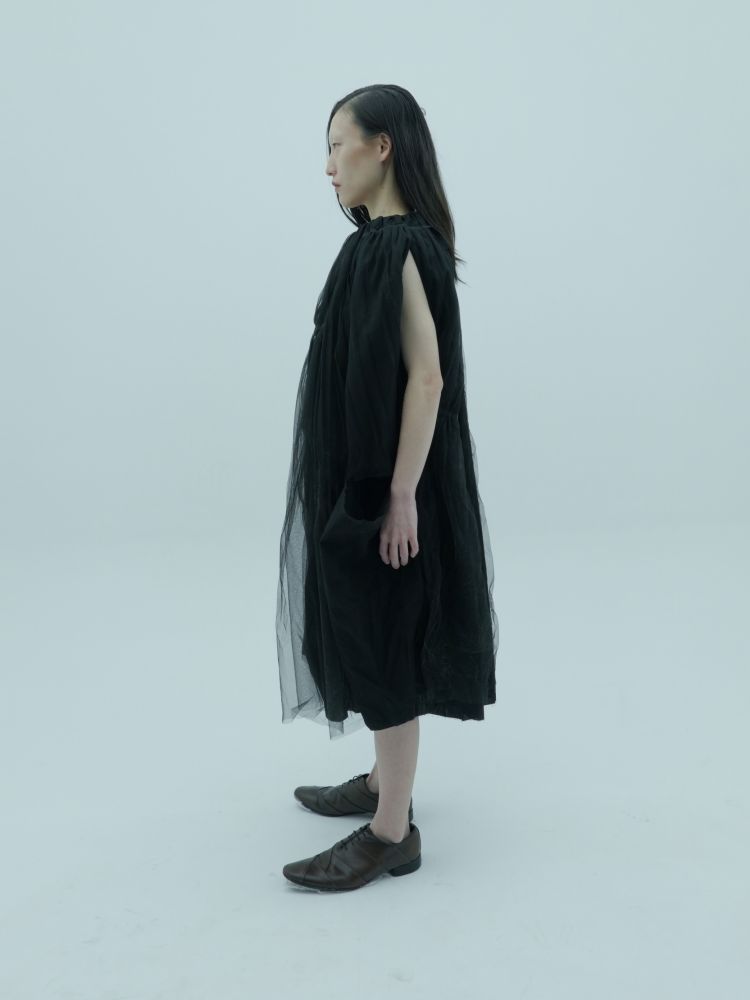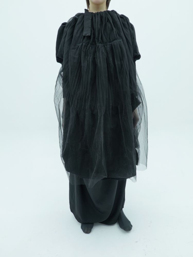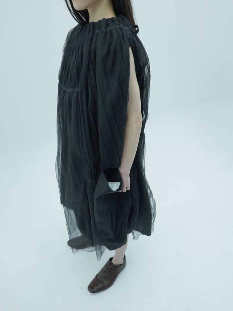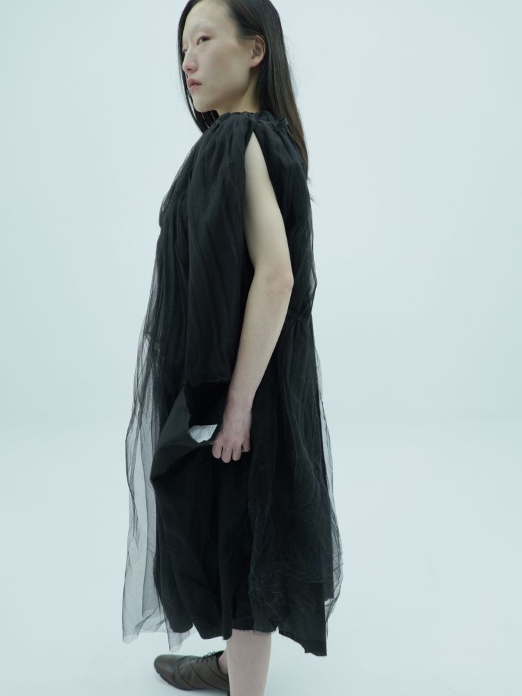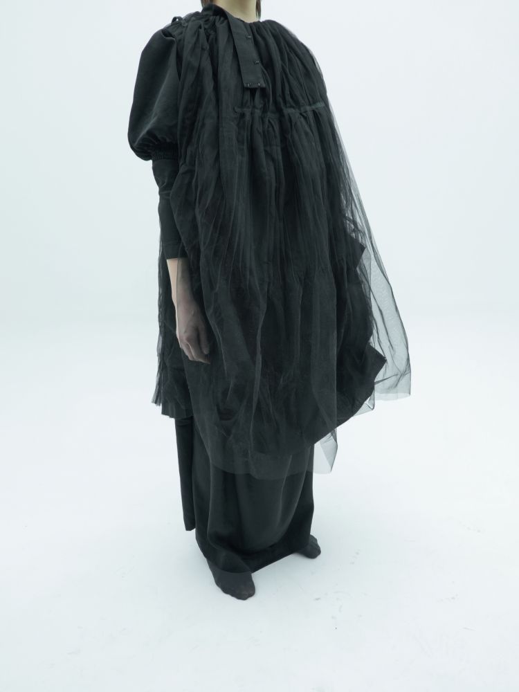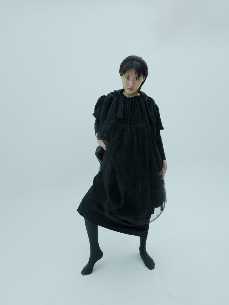 에옹쓰의 2026 샤샤 드레스. 케이프 뉘앙스로 고풍스럽게 착용되나 박다 만 듯한 테이프감, 마구 구겨져있는 주름으로 괴랄한 느낌이 더해진 샤샤 드레스 입니다. 뒷쪽에 달려있는 지퍼로 팔을 넣어 착용되며,주름작업을 거친후 손으로 하나하나 잡아내어 봉제하는 고난이도 작업으로 우글우글 우는 듯한 러프한 느낌이 더해져있습니다. 거침으나, 에옹쓰만의 고풍미. 그리고 툭튀가 더해진 샤샤드레스는 오직 블랙 한 컬러! eont's 2026 SHSAHA DRESS inspired by grandma